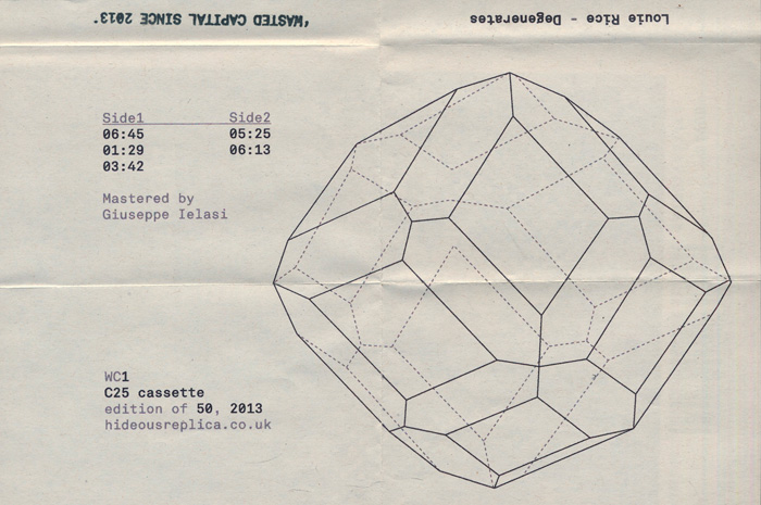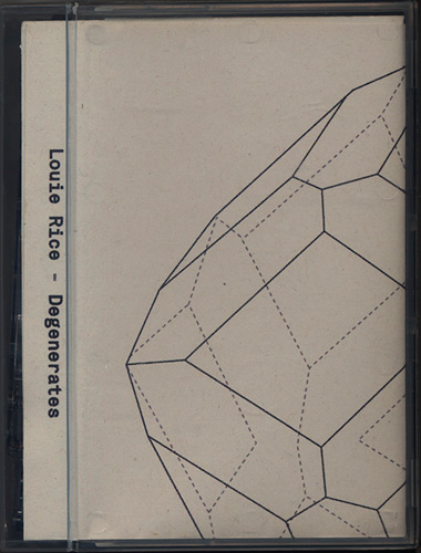 Louie Rice‘s Degenerates (WC1) is also a cassette, five tracks pasted onto a short C25. The London-based Rice is in fact the owner of this label and also its parent label Hideous Replica, which he runs with the help of Vasco Alves. Again we last heard the pair of them on Foredoom, where they performed as the duo ARAR to create Amplified Duo II – a process piece involving radio and synths, which was curiously unsatisfying at some level as I recall. Degenerates is an improvement, even if it’s not especially easy to listen to. Like with N.D.N.L. above, it seems there has been a concerted effort to reduce electronic music to a series of blanked-out, nondescript tones, and perform them with absolutely no passion or emotion. Rice likewise eschews melody, patterns, rhythms, or shape; odd formless tones just tumble out of the machines. Yet it’s strangely compelling. At the very least, since no artificial means such as sequencers have been used to propel the sounds, you can detect the hand of a human being turning knobs and working sliders in a reliably arbitrary and subjective fashion.