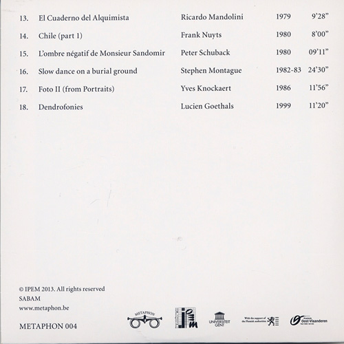 このコンピレーションで選択されたのは、Lucien Goethals、Didier Gazelle、Louis De Meester、David Van de Woestijne、Stefan Beyst、Helmut Lachenmann、Boudewijn Buckinx、Karel Goeyvaerts、Emmanuel Van Weerst、Peter Beyls、Raoul De Smet、Frank Nuyts、Ricardo Mandolini、Peter Schuback、Stephen MontagueとYves Knockaertなどで全てのトラックはIPEMスタジオのオリジナルマスタードからの未発表曲。